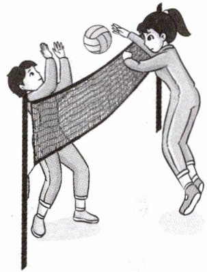 3. 如图是某场女排比赛的场景,发球时,排球被抛出后又落向地面,是因为它受到____的作用。扣出后的排球被拦回,说明力可以改变物体的____。