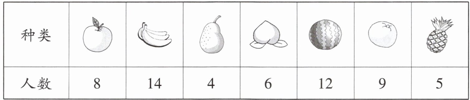 三、下面是二(1)班同学最喜欢吃的水果统计情况,请你根据统计表的数据回答下面的问题。