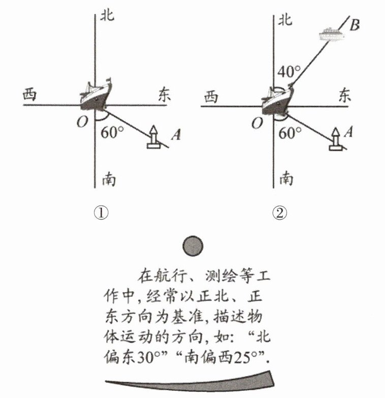 解:以点 O 为顶点,表示正北方向的射线为角的一边,画40°的角,使它的另一边 OB 落在东与北之间.射线 OB 的方向就是北偏东40°,图②,即客轮 B 所在的方向.