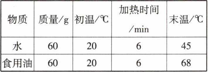 (2)由下表中的数据可知,加热结束时,水的温度比食用油的温度
