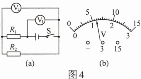 10.易烊同学按如图4(a)所示电路进行实验,当开关闭合后$,V_1$和$V_2$的指针位置完全一样如图4(b)所示,电路各处完好,则$R_1、$$R_2$两端的电压分别是(
