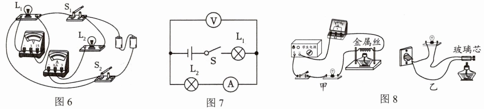 14.如图8所示两个实验,若点燃两个实验中的酒精灯,实验甲用酒精灯加热金属丝,实验乙将灯丝断开的玻璃芯加热到红炽状态时,灯泡将发光,下面描述这两个实验现象中说法正确的是(