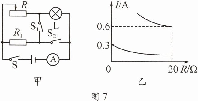 7. (2023·海南)如图7甲所示的电路,电源电压保持不变,灯泡L上标有“6 V 0.3 A”的字样,滑动变阻器R上标有“20 Ω 2 A”的字样,电路工作时不考虑灯丝电阻变化,并保证电路安全。只闭合开关S时,电路的最小总功率为$P_1$;开关S、$S_1$、$S_2$均闭合时,电路的最小总功率为$P_2$。在这两种情况下,移动滑动变阻器R的滑片,得到电流表的示数I随滑动变阻器阻值R变化的关系图像如图7乙所示。由此可得,电源电压U=