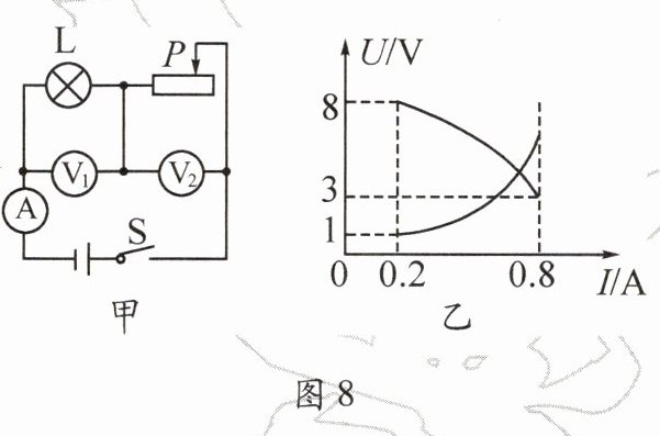 8. 如图8甲所示的电路,电源电压保持不变,闭合开关S,从最右端向左移动滑动变阻器的滑片P,直到灯泡L正常发光时停止移动,电流表的示数与两电压表示数的关系如图8乙所示。下列分析正确的是(
