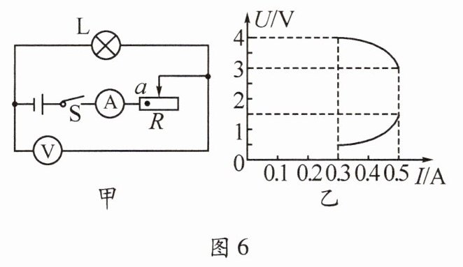 6. (2024·广安)如图6甲所示的电路,电源电压恒定,电流表的量程是0~0.6 A,电压表的量程是0~3 V。闭合开关S,在将滑动变阻器R的滑片从最右端向左移到a点的过程中,滑动变阻器R和灯泡L的U-I图像如图6乙所示。当滑动变阻器R的滑片在a点时,灯泡L恰好正常发光。下列说法正确的是(
