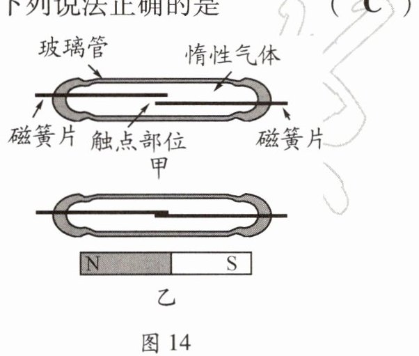 4. 如图14甲所示为干簧管开关的结构图,其中被固定于玻璃管内的磁簧片是一种有弹性、易被磁化的软铁簧片。将条形磁体靠近并与干簧管平行放置时,干簧管的磁簧片触点就会闭合,电路接通,如图14乙所示;当让条形磁体远离干簧管时,触点就会断开。下列说法正确的是(