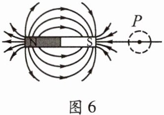 9. 如图6所示为一条形磁体附近磁感线的示意图。若在靠近条形磁体S极的P点放一个小磁针(按虚线指示放置,小磁针深颜色的一端为N极),当小磁针保持静止时,下列示意图中正确表示小磁针的N极在P点的指向的是(