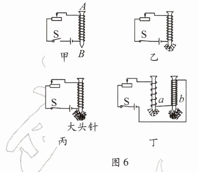 6. 为了探究电磁铁的磁性强弱跟哪些因素有关,小红用漆包线(表面涂有绝缘漆的导线)在大铁钉上绕若干匝,制成简单的电磁铁,如图6所示是小红在实验中观察到大铁钉吸引大头针的四种情形。