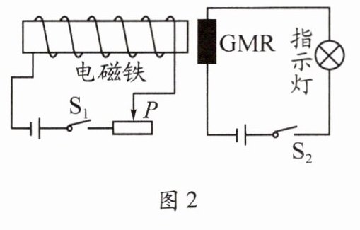 2. (2024·乌鲁木齐)如图2所示是演示巨磁电阻(GMR)特性的原理示意图。开关S₁、S₂闭合时,向左稍微移动滑动变阻器的滑片P,指示灯的亮度明显变亮。将滑动变阻器的滑片P向左移动时,电磁铁周围的磁场