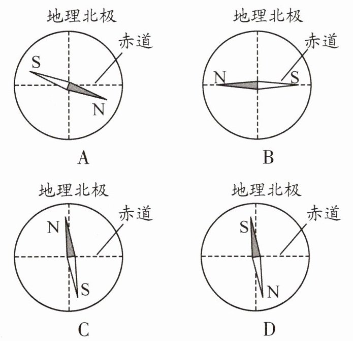 6. 将自由转动的指南针放在地球表面的赤道上,下列示意图能够表示指南针静止时的指向的是(