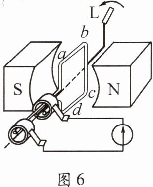 8. 如图6所示,发电机摇把L正在摇动,①表示指针可左右来回摆动的电流表,线圈平面正好处在竖直位置。下列说法正确的是(