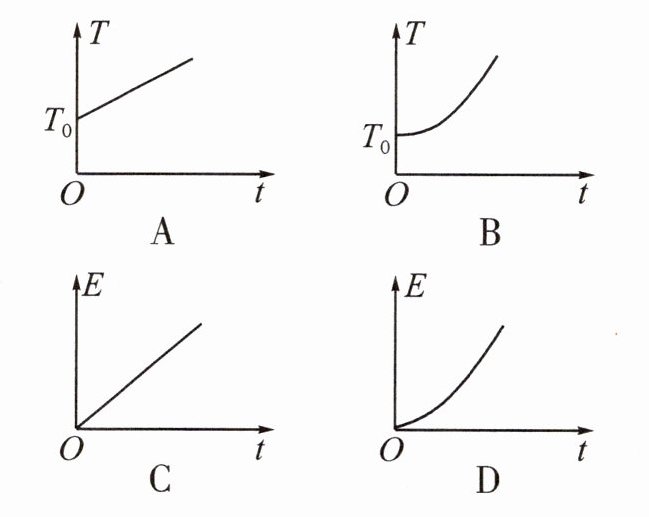 4. (2023·南通)如图8所示,小明用相同时间内放出的热量相同的电加热器给初温为T₀的液体加热。若相同时间内液体吸收的热量相同,不考虑热量散失,下列表示液体的温度T和液体的内能E随加热时间t变化的关系图像中,可能正确的是 (
