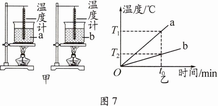 3. 如图7甲所示,用相同的酒精灯分别给a、b两种液体加热,根据测得的数据分别描绘出两种液体的温度随时间变化的图像,如图7乙所示。在相同的时间内,a、b两种液体吸收的热量相等,不计液体的热量散失,分别用m_a、m_b、c_a、c_b表示a、b两种液体的质量和比热容。结合图中信息,下列推断正确的是 (