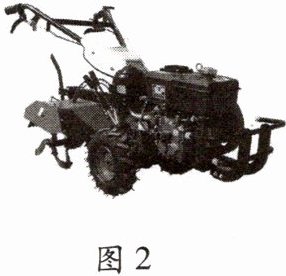 8. 图2所示为某型号柴油四驱微耕机,它在我国农业生产中应用广泛。用于犁地时,该柴油机的工作效率η为35%,耗油量为每小时4 kg。在工作过程中,为防止柴油机温度过高,采用循环水冷却,其散热器中装有初温为25 ℃、质量为5 kg的水。[柴油的热值$q = 4.3 × 10^7$ J/kg,$c_{水} = 4.2 × 10^3$ J/(kg·℃)]求: