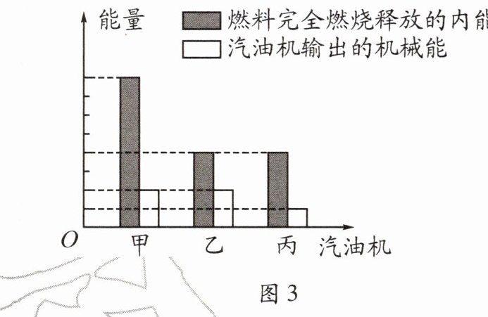 2. (2024·南通)图3所示为甲、乙、丙三台汽油机的燃料完全燃烧释放的内能和输出机械能的二维柱状图。根据图中的信息,下列说法正确的是