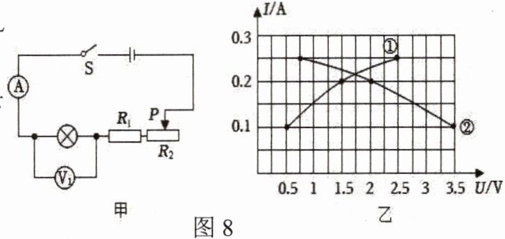 15.小组的同学设计了如图8甲所示的模拟调光电路,电源电压恒定$,R_1$为定值电阻,闭合开关S后,将滑动变阻器$R_2$的滑片P由最右端向左移动,直至灯泡L正常发光,此过程中,电流表A的示数随两电压表$V_1、$$V_2($电压表$V_2$未画出)示数变化关系图象如图8乙所示。下列说法正确的是(