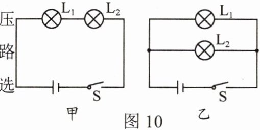 22.如图10所示,灯泡$L_1$标有“6V 3W”、$L_2$标有“6V 2W”字样,电源电压6V恒定不变。闭合开关S,忽略温度对灯丝电阻的影响,则甲、乙两电路中流过$L_1$的电流$I_1∶I_1′=