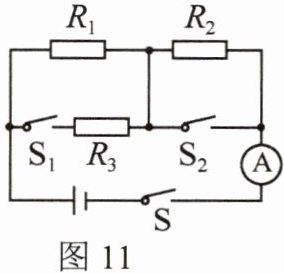 23.如图11所示的电路,电源电压保持不变,电阻$R_1= 10Ω,R_2= 20Ω,$若开关$S_1、$$S_2$断开,S闭合,电流表示数为0.2A,则电源电压是