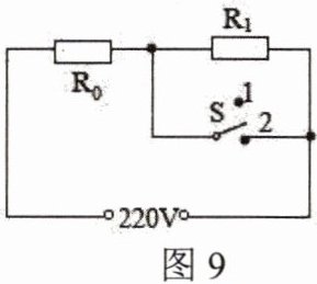 21.有一种电热水壶有“烧水”和“保温”两个挡,如图9所示是其内部简化电路图,已知$R₀= 44Ω,R_1= 1056Ω,$当S接1时,电热水壶处于