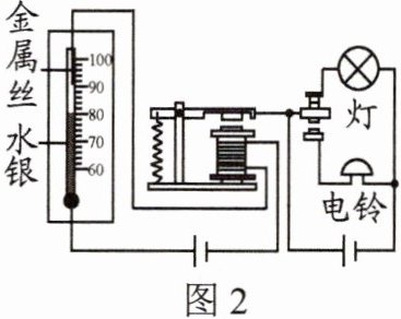 5.小明利用水银能导电的特性制作了一个温度自动控制报警器,如图2所示,关于它的说法正确的是(