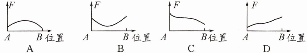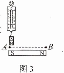 7.如图3所示,放在水平地面上的磁体上方有一块挂在弹簧测力计上的小磁体(下部为N极)。小辉提着弹簧测力计沿水平路线从A缓慢移到B,则下图中能反映弹簧测力计示数F随位置变化的是(