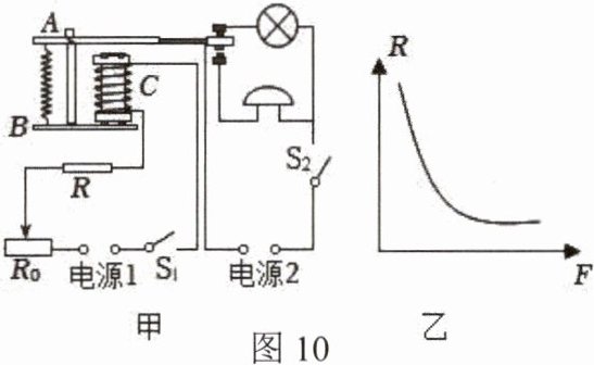 17.小明设计了一个道路限载报警器,原理如图10甲所示。R₀是滑动变阻器,R是压敏电阻,R的电阻随压力变化关系如图乙所示,当超载车辆通过压敏电阻时,限载报警器铃响报警。如果要适当调高报警的限载重量,下列操作可行的是(