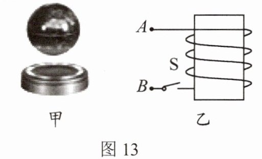 20.如图13甲所示为一磁悬浮地球仪(上半部为北半球,下半部为南半球),球体中有一个磁铁,它能大致模拟地磁场的分布特点。环形底座内有一金属线圈,其电路原理如图乙所示。地球仪工作时,球体悬浮于空气中,此时球体的重力与