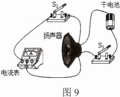 16.将扬声器、电池和电流表等元件连成如图9所示电路。断开$S_2,$反复快速闭合、断开开关$S_1,$扬声器发出咔咔声,断开$S_1,$闭合开关$S_2,$反复轻敲扬声器的纸盆,会看到电流表的指针左右摆动。下列有关说法正确的是(