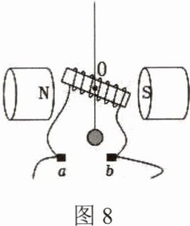 15.如图8所示是小明设计的一个简易电流表,图中N、S为永磁体的两个磁极,线圈和指针成一定的角度固定在一起,当有电流通过线圈时在磁力的作用下指针和线圈一起绕着O点发生偏转,指针下端配有重球,a、b是简易电流表的接线柱,下列说法正确的是(