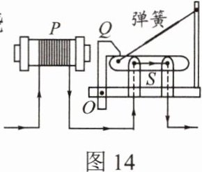21.如图14所示是“空气开关”工作原理示意图。图中P是电磁铁,S为开关,Q是可绕O转动的衔铁。当电路中电流过大时,电磁铁的磁性变