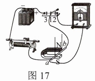 24.如图17所示实验装置中,磁体和导体棒均水平放置,将开关的接线柱1与2接通,保持磁体不动,使导体ab向右水平运动,灵敏电流计G指针向左偏转。若要使G的指针向右偏,可使导体ab向
