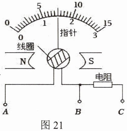 28.小明对电压表指针偏转的原因产生了兴趣,他在实验室找到一只可拆卸的电压表,拆开后电压表的内部结构图如图21所示。(1)在使用电压表测电压时,应该将电压表与被测用电器_____联接人电路中,图中接AC时,所选的量程为_____(选填“0~3V”或“0~15V”)。(2)正确接入并通电后线圈转动,带动指针偏转;撤去磁体再次通电,指针不动。这说明电压表指针偏转的原因是通电线圈在_____中受力转动,这与_____的工作原理相同。(3)若在电压表AB接线柱之间连接一根导线,用手拨动电压表指针,导线中会产生感应电流,这种现象叫做_____,据此可制成_____。