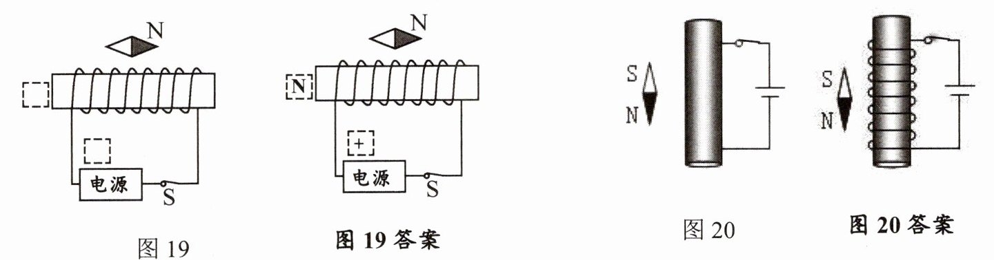 26.开关S闭合后小磁针静止时的指向如图19所示,请在图中两个虚线框内分别标出螺线管的磁极和电源的正负极。