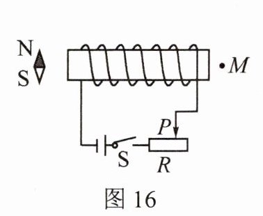 极靠近螺线管的左端,当向左移动变阻器滑片P时,M点的磁性将增强