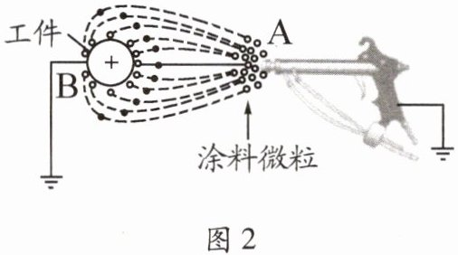 3. 如图所示为静电喷涂工件的工作原理图:待喷涂的工件B带正电荷,A处的静电喷枪使雾化了的涂料微粒带上负电荷,由于异种电荷互相