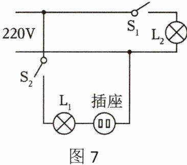 14. (多选)某同学想把两盏“220V,60W”的电灯和一个插座接入家庭电路中,他设计的电路图如图7所示,若闭合开关$S_1和S_2$,下列现象会出现的是(