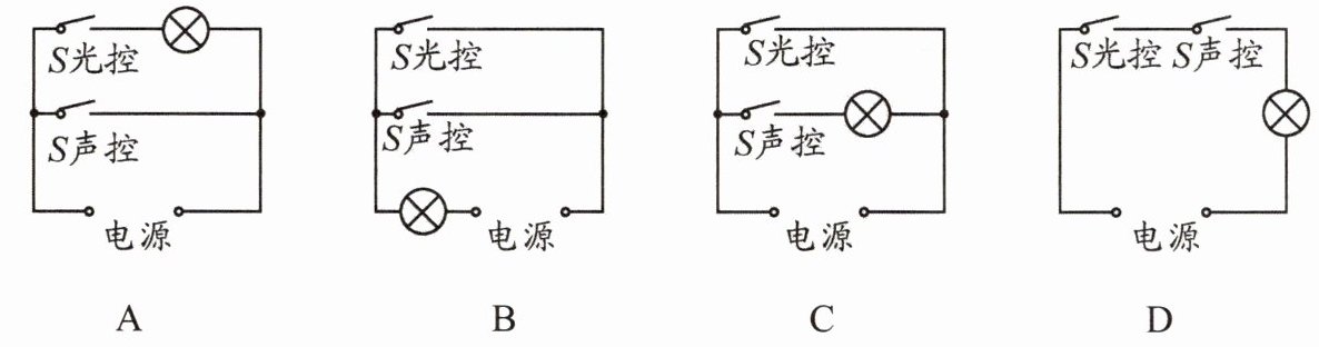 13. 楼道里,夜间只是偶尔有人经过,电灯总是亮着会浪费电能。小明和小刚利用“光控开关”(天黑时自动闭合,天亮时自动断开)和“声控开关”(当有人走动发出声音时,自动闭合,无人走动没有声音时,自动断开)设计了电路,使楼道照明变得智能化。下列选项中符合智能化要求的电路图是(