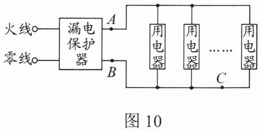 20. 如图10所示是家庭电路的一部分。当用电器正常工作时,电路中A处和B处的电流大小关系是$I_A$