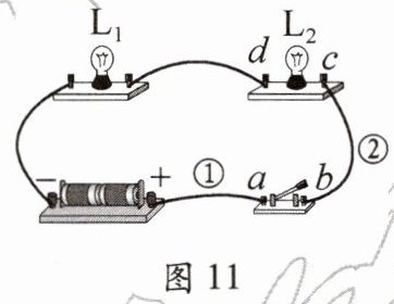 2. (2023·盐城)在如图所示的电路中,闭合开关,L₁、L₂两个灯泡都不发光。为了找到灯泡不亮的原因,小明将一根完好的导线一端固定在电源正极上,将其另一端依次接触a、b、c、d四个接线柱,发现只有与d接线柱接触时灯泡L₁才发光。若电路中只有一处断路,其位置可能是 (