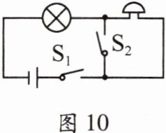 C.同时闭合S₁、S₂时,铃响,灯不亮