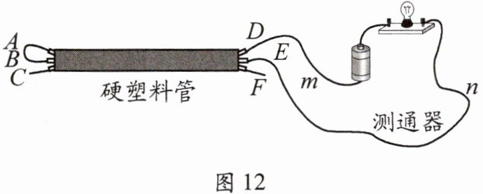 所示,一根横跨长江两岸的硬塑料管内穿有三根完全相同的电线。为了辨别哪两个线头为同一根电线的两端,电工连接A和B,将测通器的m连接在D上,n连接E时小灯泡不发光,n连接F时小灯泡仍不发光。由此可以判断,为同一导线两端的是 (