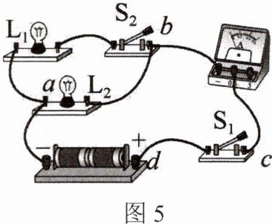 10. 如图5所示的电路中,闭合开关$S_1$、$S_2$,电流表、灯泡$L_1和L_2$均能正常工作。下列说法正确的是(