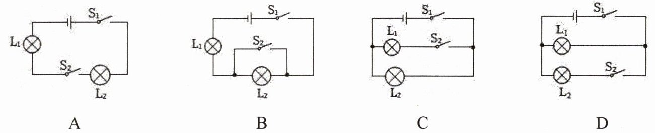 11. (2024•枣庄)为了提高行车的安全性,有的汽车装有日间行车灯。当汽车启动时,$S_1$闭合,日间行车灯$L_1$立即亮起,再闭合$S_2$,车前大灯$L_2$也亮起。下列四幅图的电路图中符合这一情况的是(