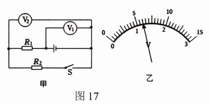 24. 如图17甲所示的电路中,闭合开关后,两个电压表指针均如图17乙所示,则$R_1$两端电压为
