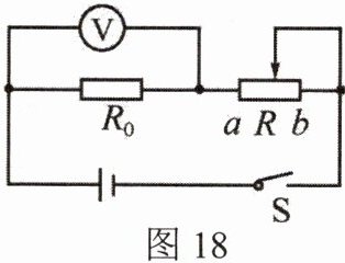 25. 如图18所示,电源电压恒定,变阻器的最大阻值为20Ω。闭合开关,当变阻器滑片移到a时,电压表示数6V;当变阻器滑片移到b时,电压表示数2V。则前后两次通过$R_0$的电流之比是