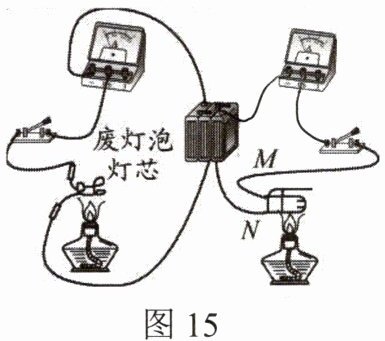 22. 如图15所示,用酒精灯对灯芯的玻璃柱加热一段时间后,电流表的指针会偏转,这表明通常情况下是绝缘体的玻璃,受热达到一定温度时也会变成