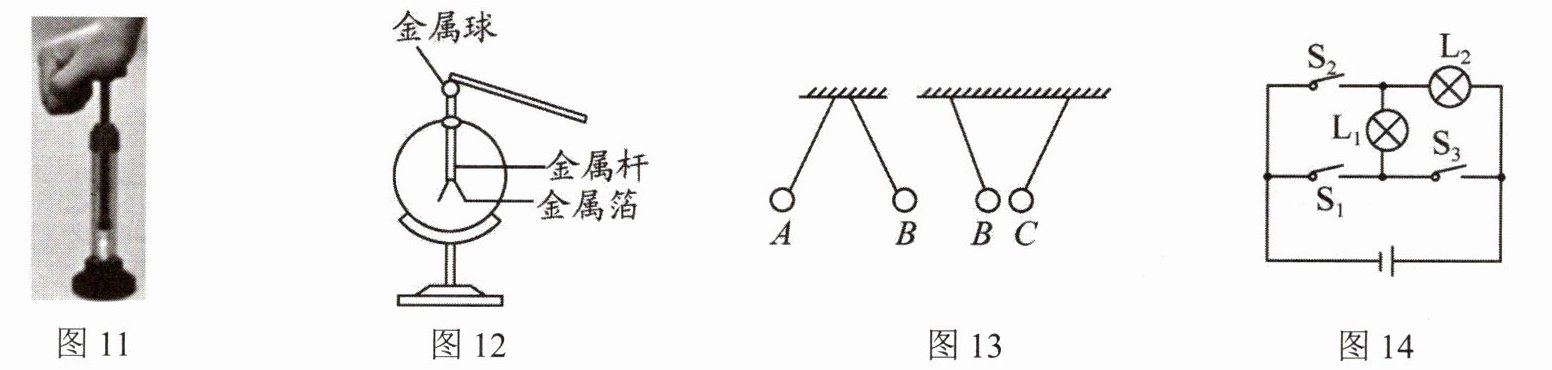 19. 如图12所示,用带负电的橡胶棒去接触不带电的验电器,发现验电器金属箔片张开。验电器金属箔片张开是因为