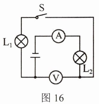 23. 如图16所示的电路中,若两盏灯完全相同,电源电压为9V,闭合开关后电流表的示数为0.3A,则电压表的示数为
