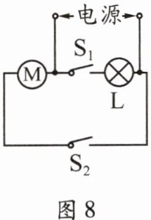 9. 如图8所示是简化的电冰箱电路图,其中M是电冰箱压缩机用的电动机,L是电冰箱内的照明灯。下列判断正确的是 (