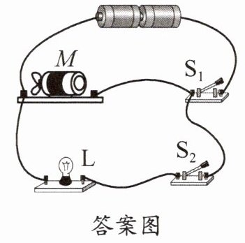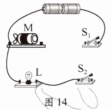 15. (2024·大兴)请用笔画线代替导线将如图14所示的实物电路补充完整。要求:开关全部闭合时,灯泡L和电动机M组成并联电路,且开关S₁能同时控制灯泡L和电动机M,开关S₂单独控制灯泡L。